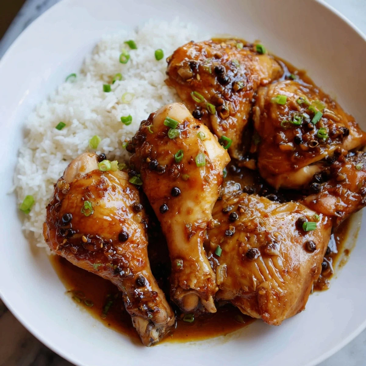 - Before you plate anything, taste a spoonful of sauce and adjust if needed—maybe a pinch more salt, or a splash more vinegar if it's too sweet. Fish out those bay leaves, then serve the chicken hot over steamed rice with a scatter of chopped scallions.