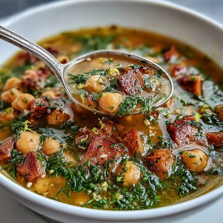Pin it My neighbor arrived at my door one rainy afternoon with a bag of fresh dill from her garden, insisting I do something special with it before it wilted. I had ham in the fridge and a can of chickpeas on the shelf, so I threw together this soup almost by accident—golden broth, tender legumes, and that impossible brightness that lemon and dill bring to everything. What started as a way to use up vegetables became the soup I make whenever someone needs comfort in a bowl.