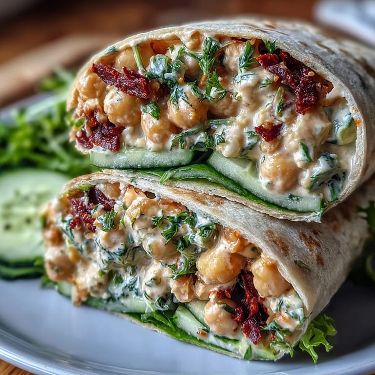 Pin it There's something wonderfully surprising about biting into a wrap and finding that creamy, tangy chickpea filling that tastes nothing like what you'd expect from canned beans. My roommate brought home sun-dried tomatoes one afternoon, and I was skeptical—until I started playing around with them in a chickpea salad. The way they soften into the vegan mayo creates this almost buttery texture that makes you forget you're eating something so simple and plant-based. Now these wraps have become my go-to lunch when I want something that feels indulgent but comes together in barely twenty minutes.